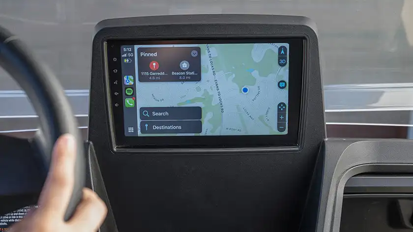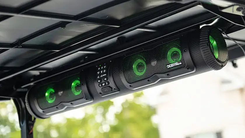 A modern digital dash cluster displays battery level, speed, and system diagnostics. The RXV also features an optional USB charging port, bright LED headlights, taillights, and turn signals. Additional options include a horn, reverse alert, and full street-legal lighting kit for enhanced safety and convenience.