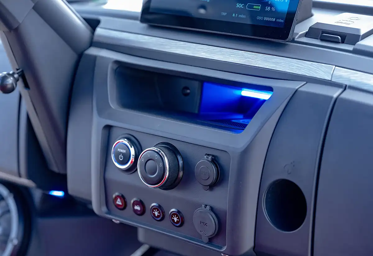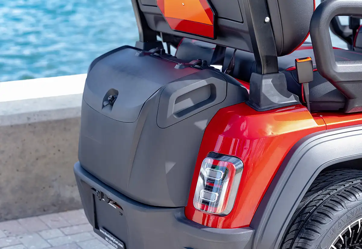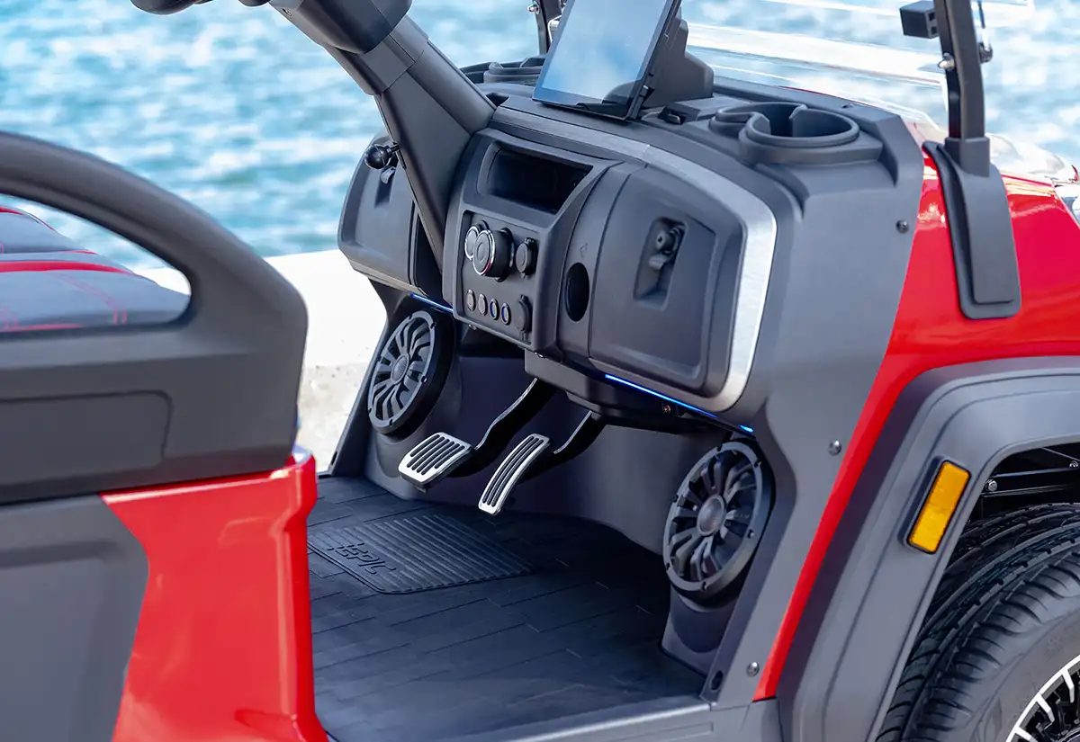 A modern digital instrument cluster keeps you informed with real-time data such as battery state, speed, and system diagnostics. The cart also includes a convenient USB charging port for your devices. Bright LED headlights, taillights, and turn signals provide excellent visibility, and optional upgrades like a horn, reverse light, and full turn signal kit add an extra layer of safety and convenience.