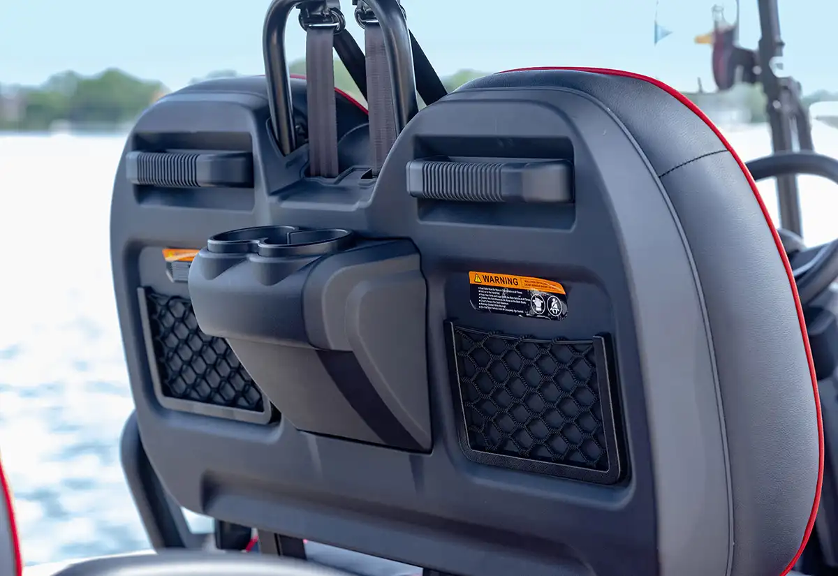 A: The E40FX includes a 10.1″ touchscreen display, USB ports, a wireless charging pad, pre-wired 12V switches, and an optional marine-grade sound system.