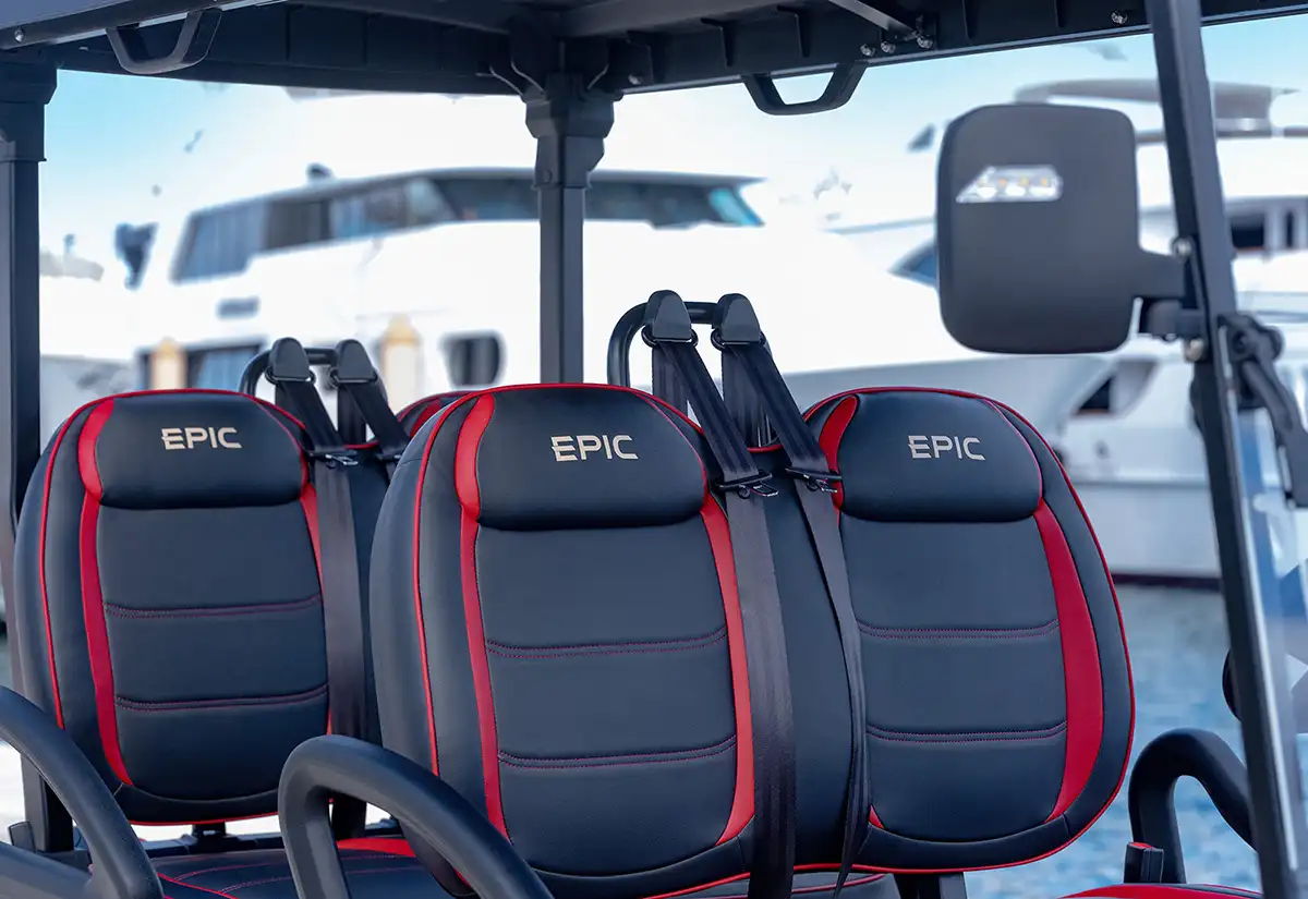 The Epic E40FX is designed with comfort and flexibility in mind. Inside, you’ll find padded bench seating for the driver and passengers, with an optional rear-facing seat that folds down to create additional cargo space. Weather-resistant upholstery ensures lasting durability, keeping the seats looking great through sun, rain, and everyday use.