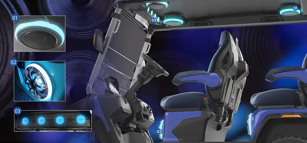 The D-Max XT4 features ergonomic, high-back bucket seats with marine-grade upholstery designed for durability and comfort. The cabin is spacious and elevated, offering great visibility and easy entry for all passengers. Optional rear cargo box or golf bag holder kits can convert the XT4 from a passenger cart to a practical utility vehicle. The dashboard layout is sleek, with automotive-inspired controls and a full-color digital instrument cluster displaying speed, battery percentage, and diagnostics.